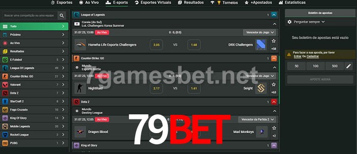 O 79Bet oferece uma grande seleção de opções de apostas em e-sports com probabilidades competitivas